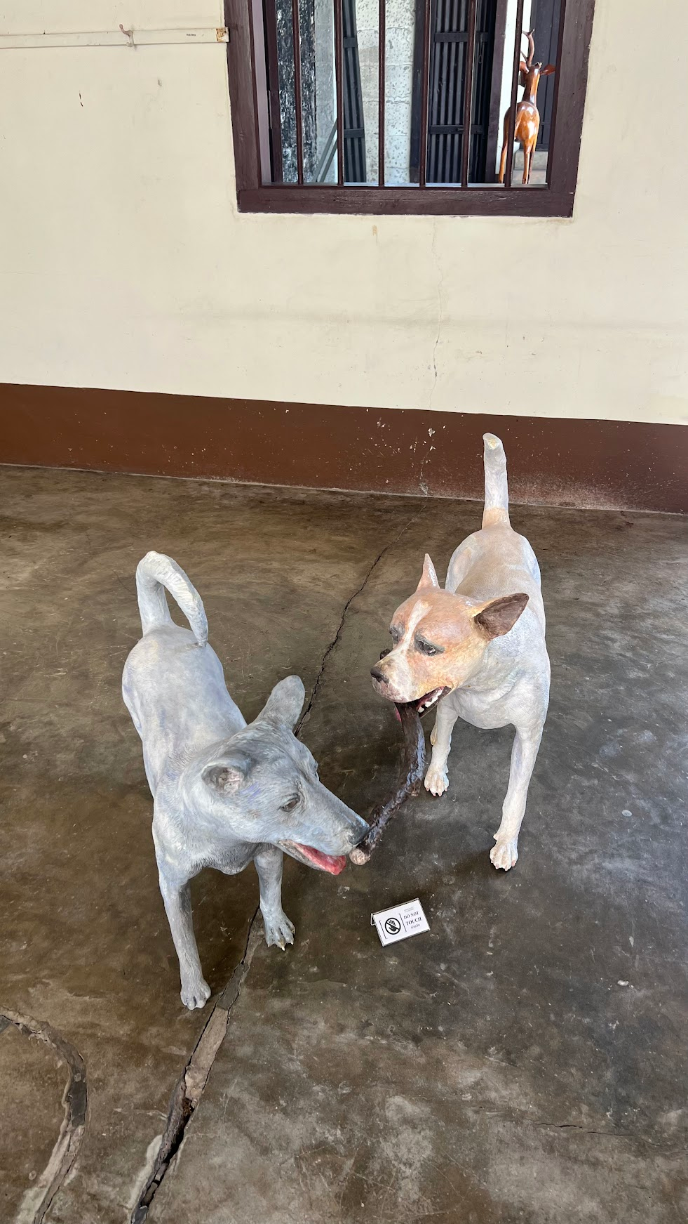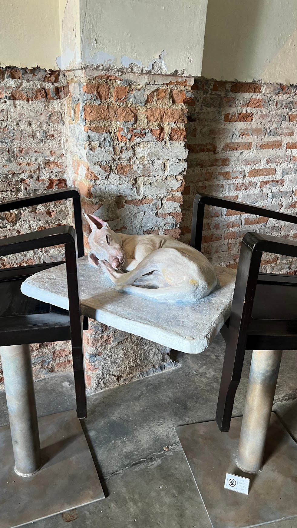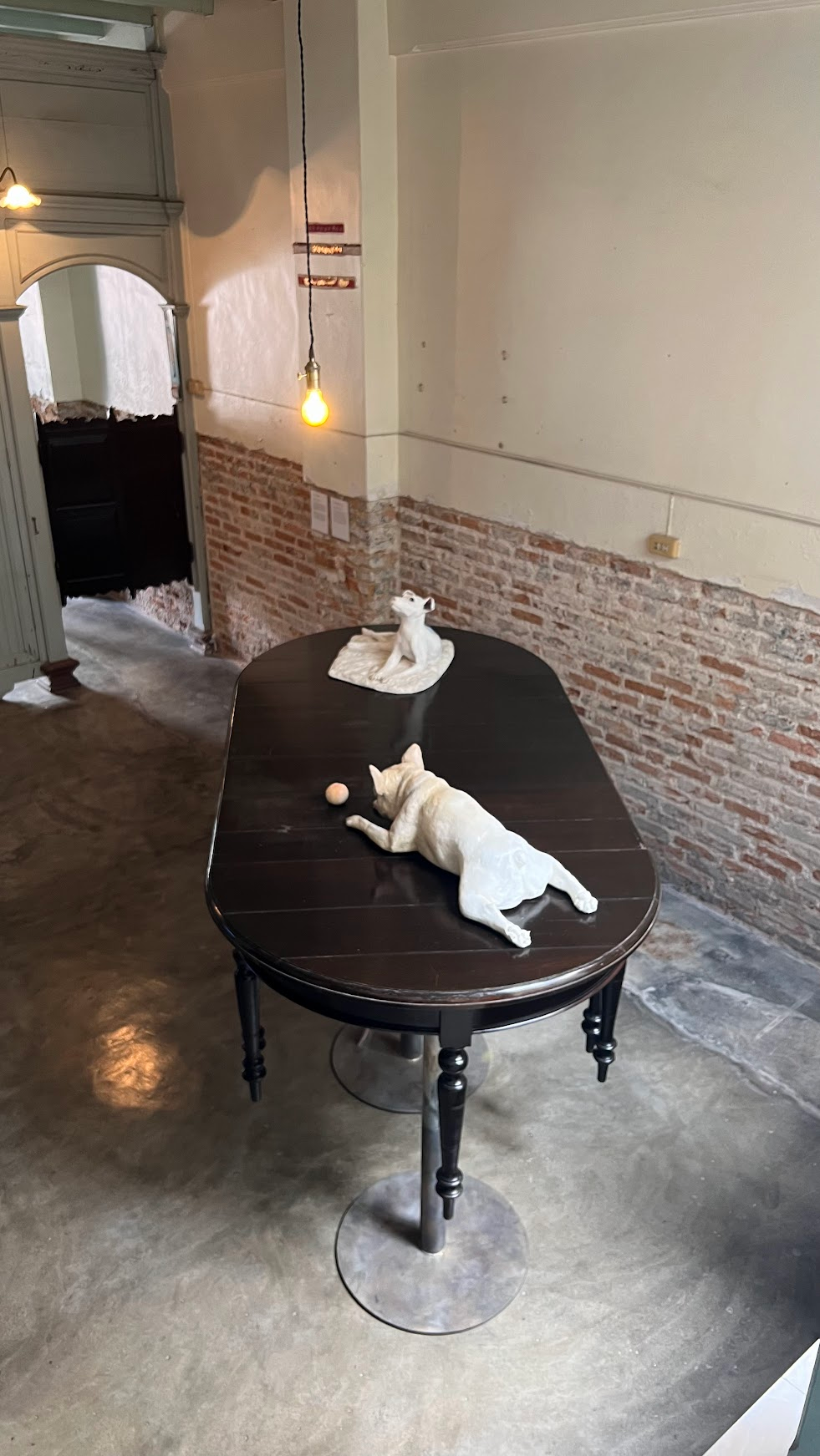 At DC Phuket Town, a traditional shophouse, Araya Rasdjarmrearnsook’s sculptures on the ground floor feel warm and lived-in. Upon entering the old house, the coolness offered by the courtyard stood in contrast to the shimmering heat rising from the streets, instantly evoking memories of summer afternoons in the Taiwanese countryside, an intimacy and nostalgia of visiting my grandparents’ home. These sculptures originated from the dogs Rasdjarmrearnsook lived with in her later years; she once noted that retreating from human society to live among animals allowed her to become more truly herself. Rather than a mere reproduction of companions, the work radiates an aura of home that fills the surroundings. Elevated on furniture supported in mid-air, the dog sculptures cradle memories and the past with a delicate lightness, blending seamlessly into the cozy environment of the shophouse.