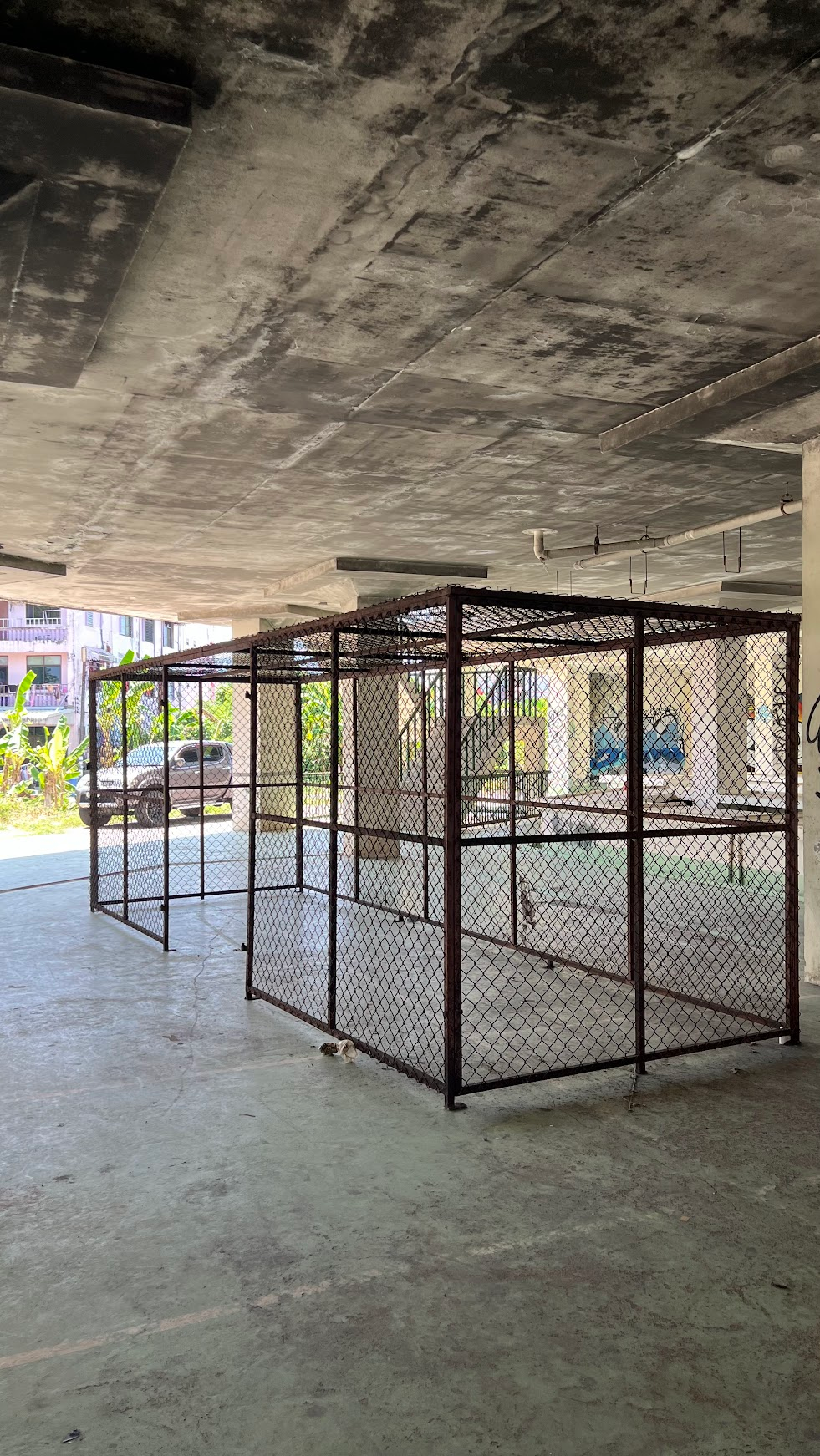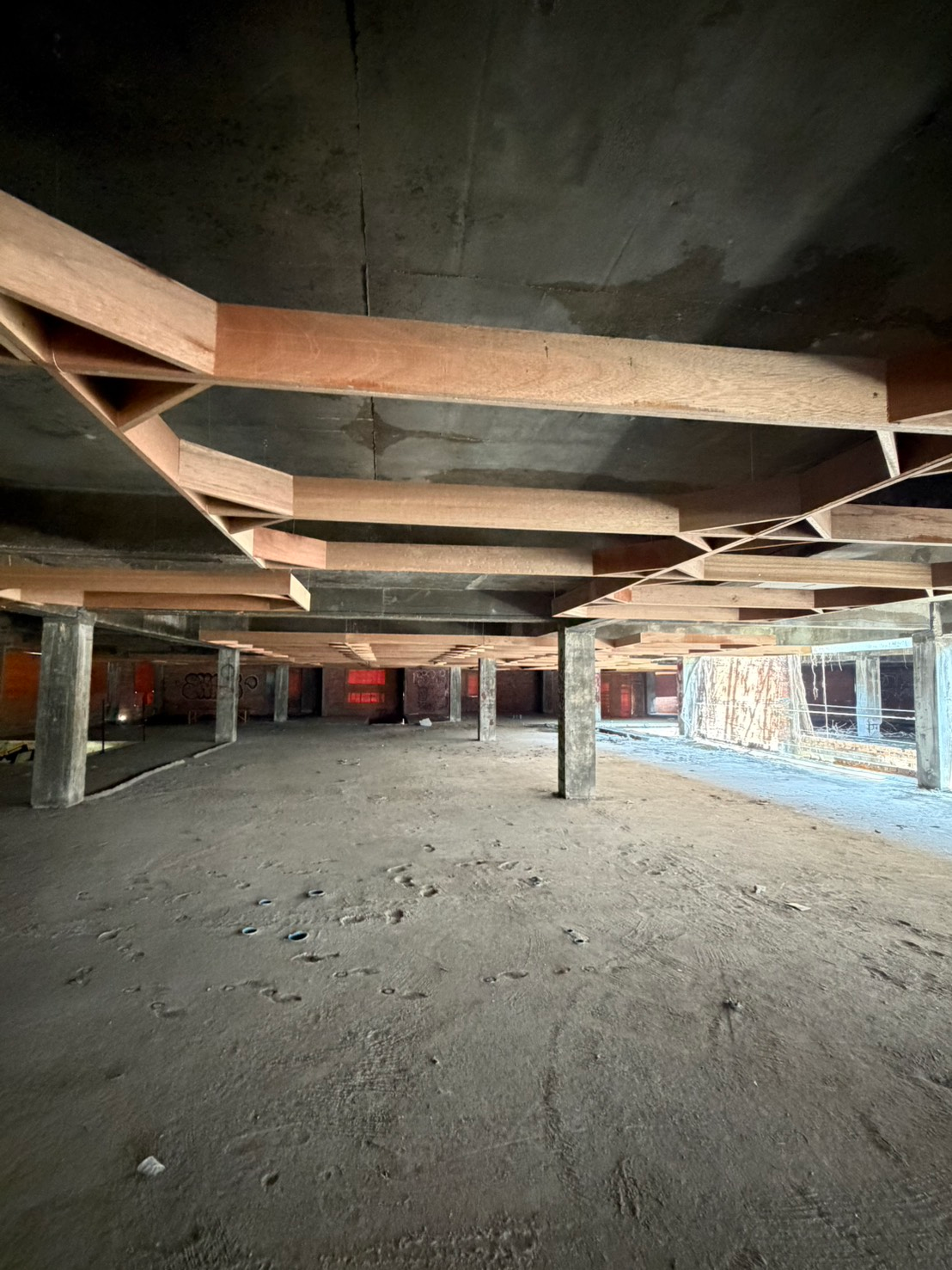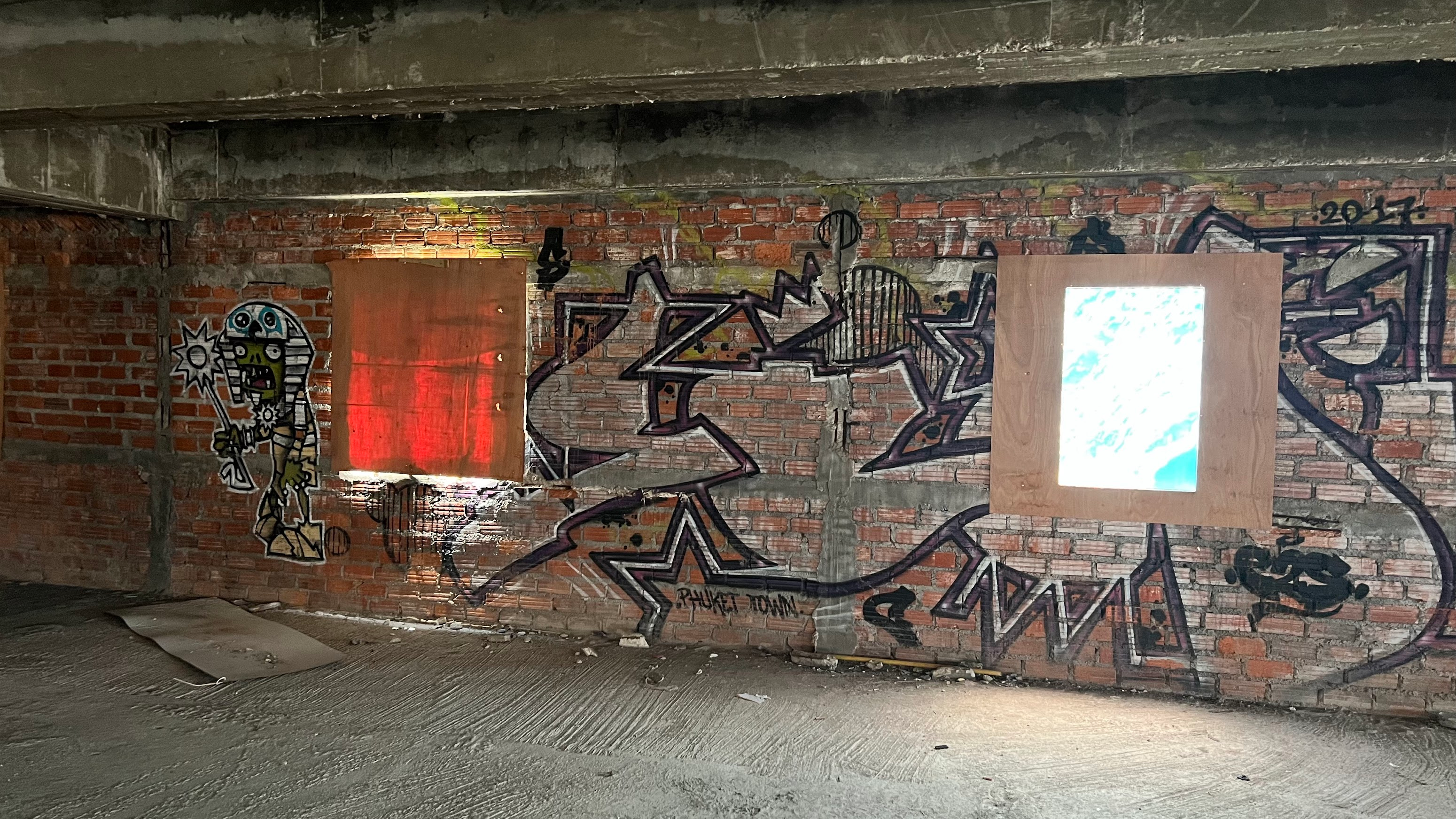 Walking in one of the venues, the Yi Teng Complex, a former slaughterhouse turned abandoned market where once a refuge for the homeless and now a canvas for graffiti, I noticed a red brick wall where one window was roughly boarded up while the other acted as a natural lightbox for conservation photography. The collision — the raw street art versus the attempt to construct a white cube by sealing off the building’s original breath — caught my attention. Between the unwashed graffiti, the cage-like fixtures, and the flooded basement filled with trash and fish, I felt the presence of ‘ghosts’: the echoes of a life that was, and still is, unfolding in these ruins.