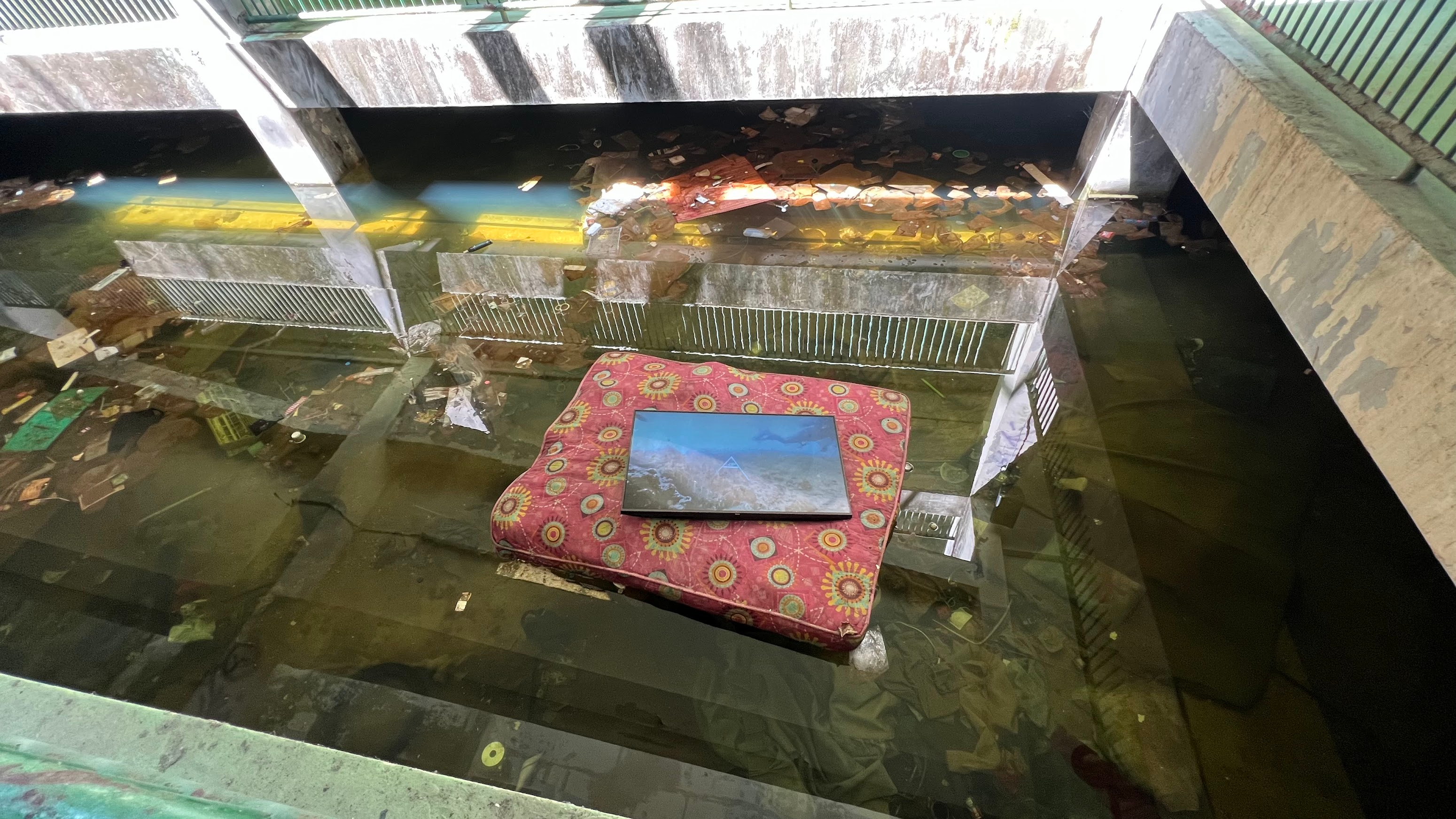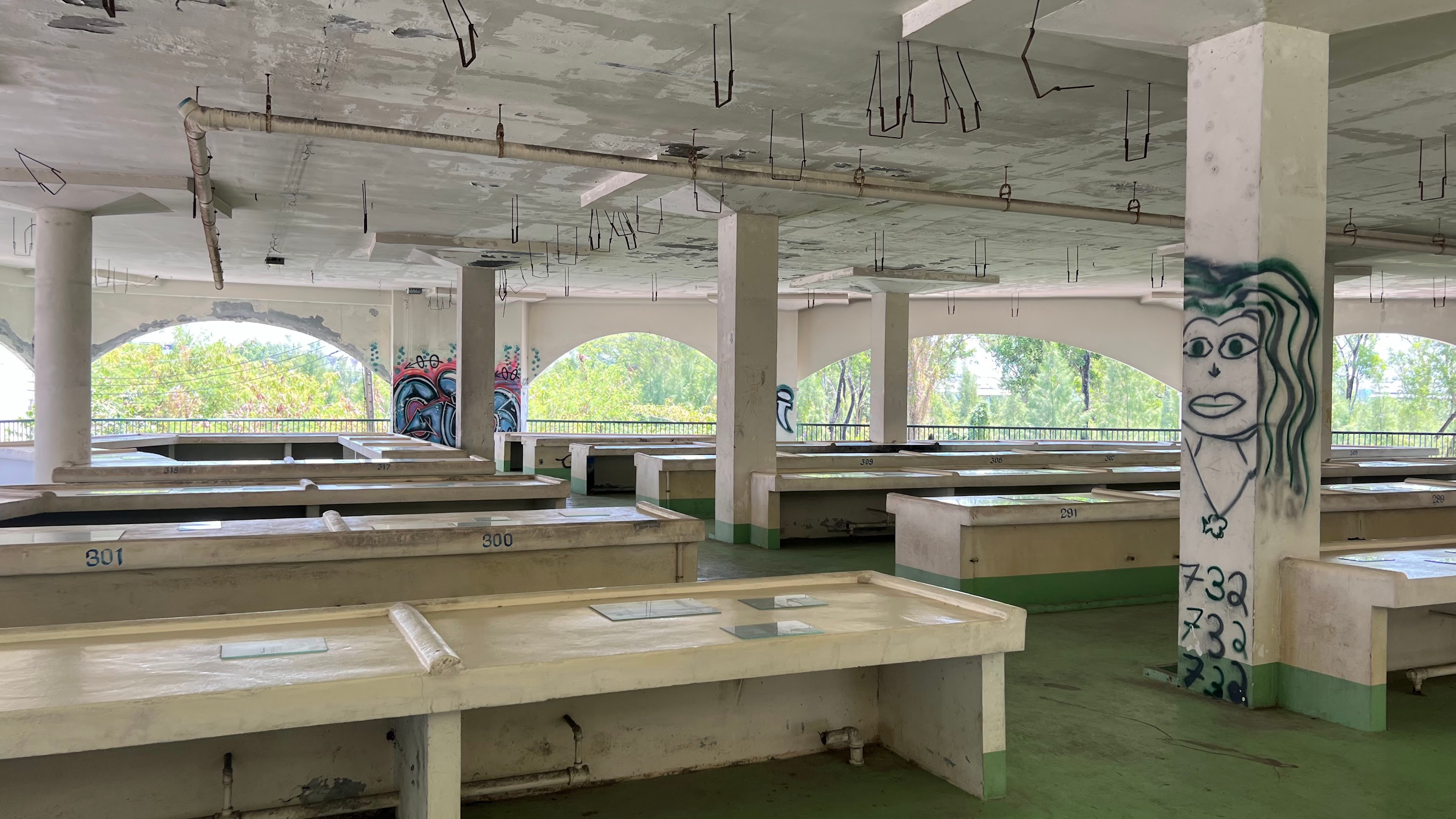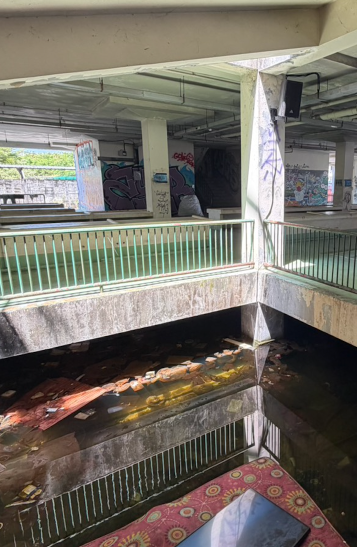 Pratchaya Phinthong presents ‘water~copy airstreak,’ a multi-media installation combining video, sound, field research, and ecological intervention at the Yi Teng Complex. The site is filled with the simulated calls of swiftlets and an array of wooden joists installed to encourage these birds to nest and inhabit the space in the future. Furthermore, drawing on recent marine biology research, the artist transmits underwater recordings of healthy coral ecosystems to a decaying reef off the coast of Phuket to accelerate its regeneration. In the exhibition space, underwater footage of this scientific research is projected against the backdrop of the market’s trash-accumulated stagnant water, creating a dialogue with the derelict building’s own aquatic ecology.
